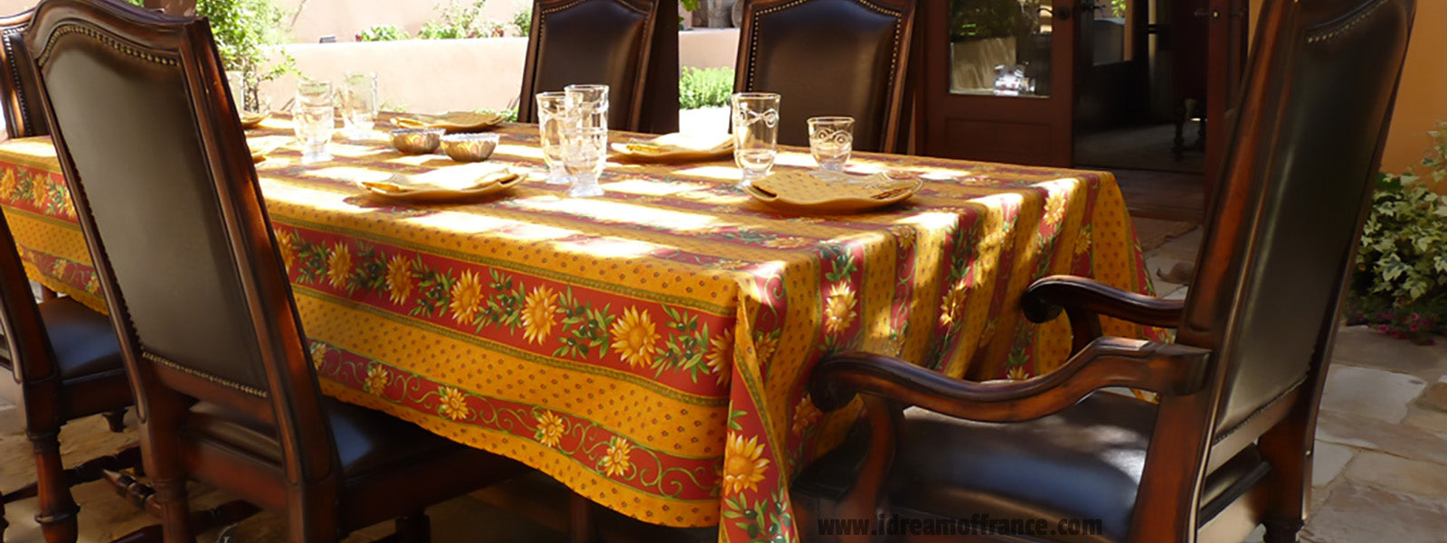 Thank you for visiting I Dream of France, your American source for French kitchen and table linens. We specialize in beautiful, colorful table and kitchen linens from the south of France. We have a large selection of stain-resistant tablecloths and placemats so you can dress up and protect your table at the same time. We also carry French soaps and gifts. Merci beaucoup!