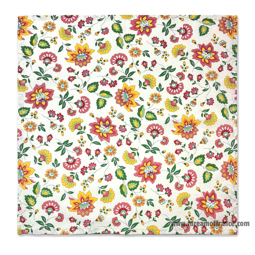 From Le Cluny French Country Collection, these cotton napkins will complement our Fayence Cream tablecloths or placemats or just look great on their own. It features an allover pattern with red and yellow flowers on a cream background. They are 100% cotton.