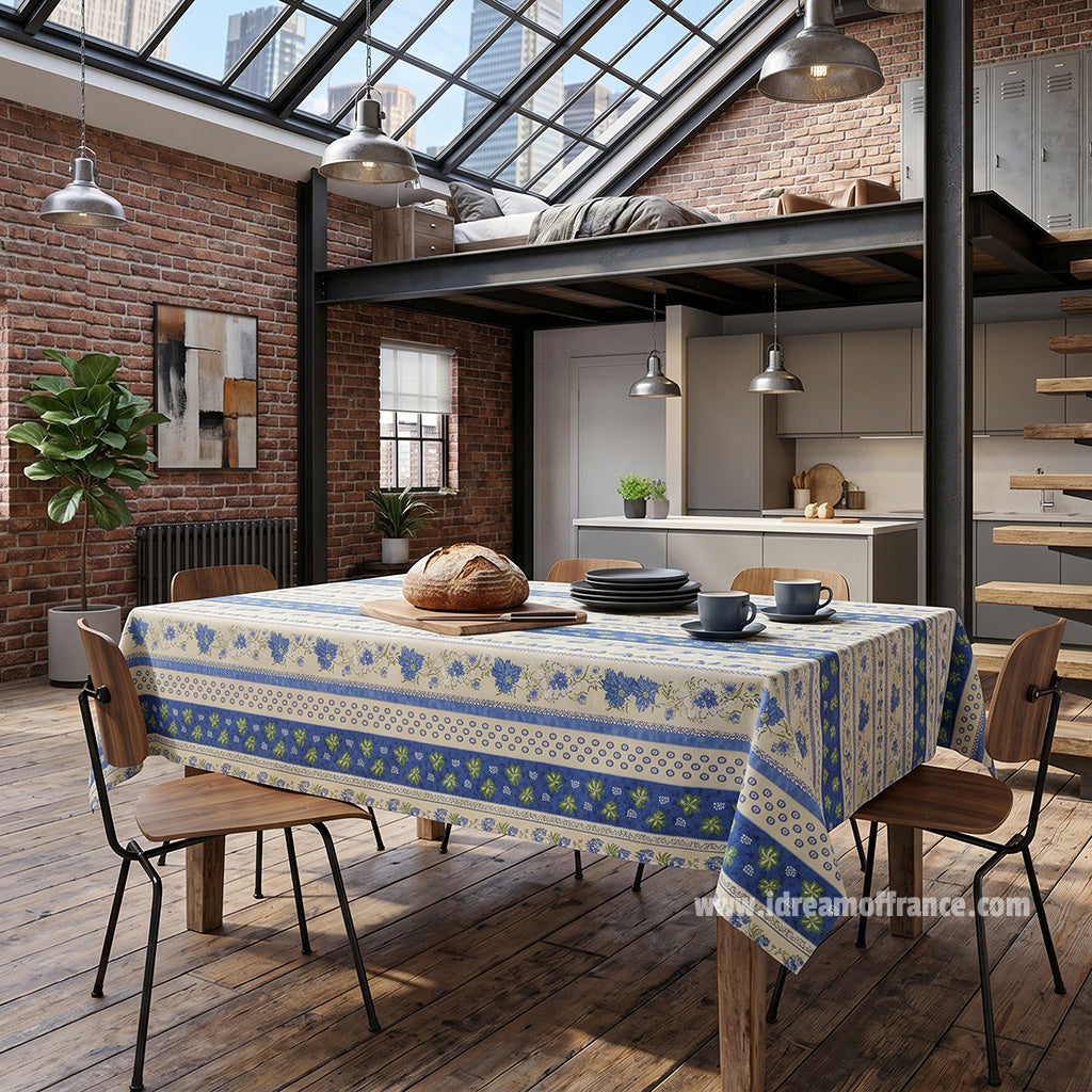 French Provencal tablecloth - Acrylic coated cotton, Spill-proof - Rectangular - Monaco beige & blue | Le Cluny