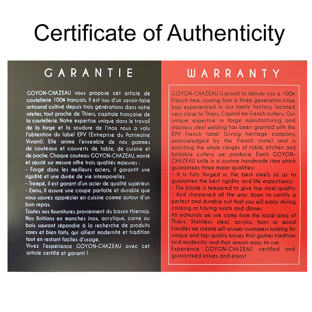 Among the various manufacturers of Laguiole knives, one name rises above the rest: Goyon-Chazeau. These knives are entirely made by hand in-house, step-by-step, from raw stainless-steel and precious woods by skilled artisans. You can see the process involved to create each and every knife in the manufacturer's video below. Traditional bees adorn these exquisite knives. The thick blades are forged for unmatched strength and durability. They are stainless steel with handles carved of exotic woods: olive wood, juniper, rosewood, kingwood, boxwood, and sandalwood. The entire knife is smoothed to perfection and the result is a product that looks more like fine jewelry that tableware! These knives can be sharpened over and over and will last for many years to come. The six knives come in an attractive solid-oak, finger-jointed, storage box.