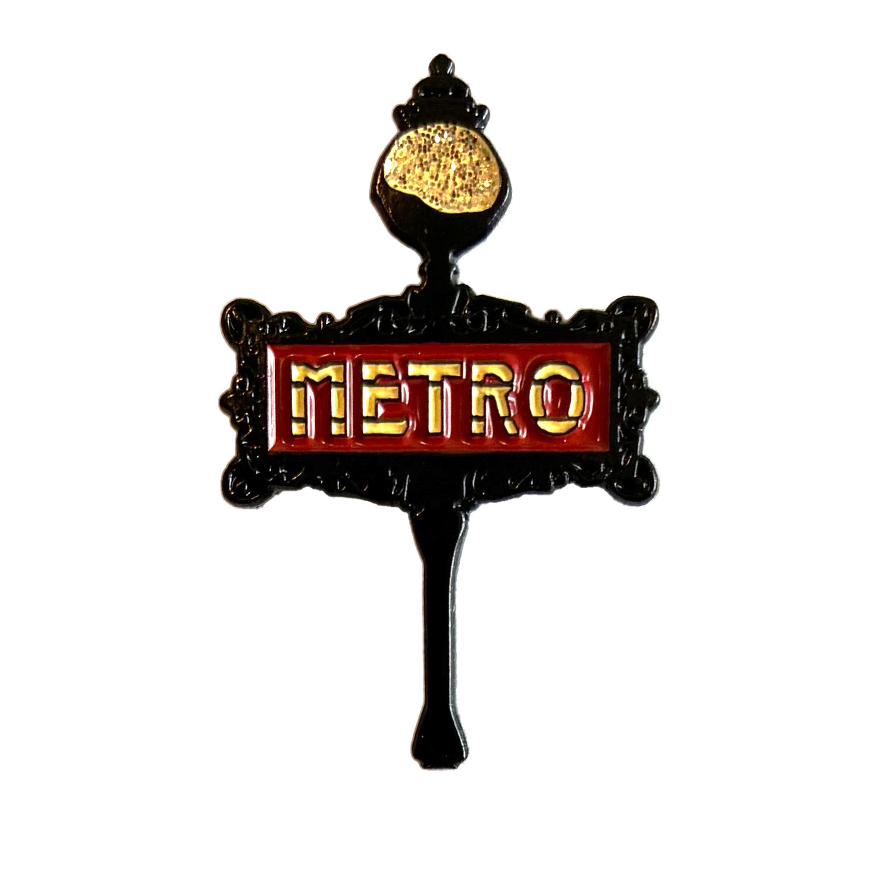 The pin looks like the old-fashioned metro signs that are posted near the entrance of some of the metro stations in Paris. The top of the pin is sparkly to suggest the light of the globe mounted on top of the sign.